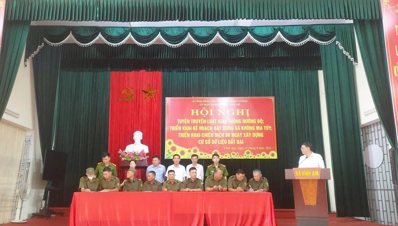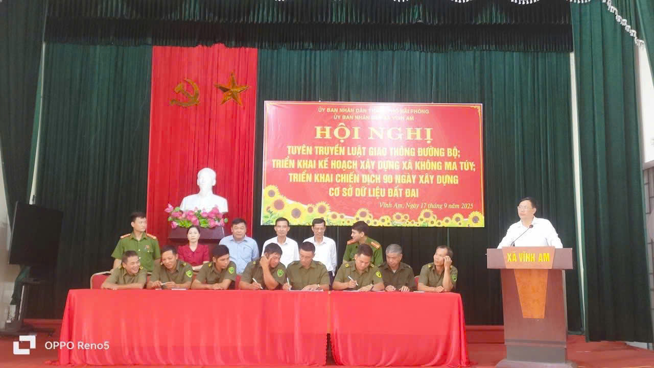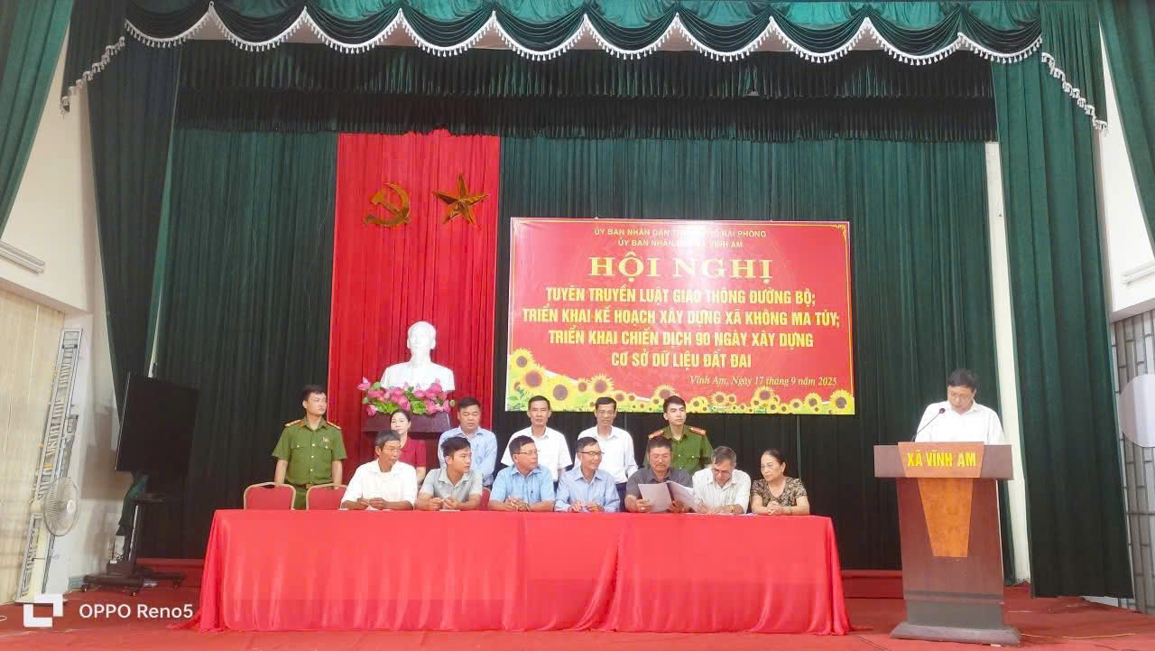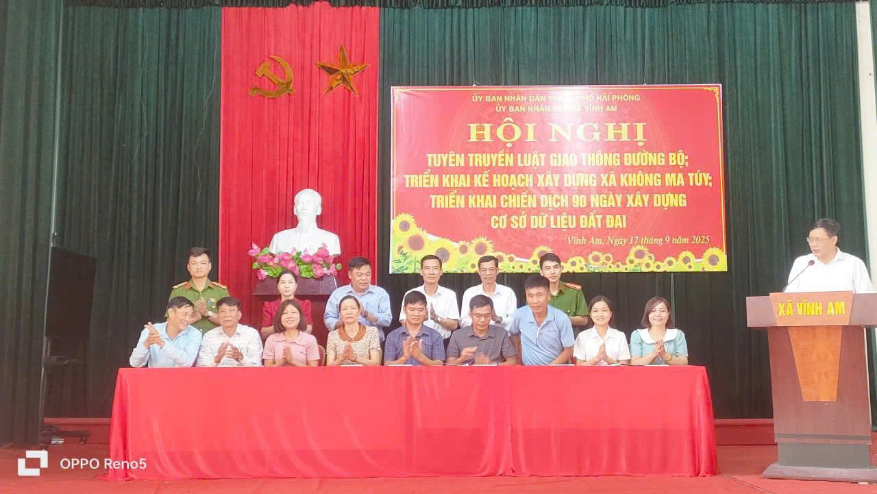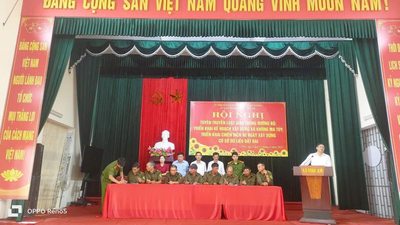Sáng ngày 17/9/2025 UBND xã Vĩnh Am tổ chức hội nghị triển khai 2 nội dung: Kế hoạch xây dựng xã không ma túy; tuyên truyền luật giao thông đường bộ; ký cam kết thực hiện xây dựng địa bàn không ma túy; đảm bảo an toàn giao thông trên địa bàn xã và Triển khai chiến dịch 90 ngày xây dựng, hoàn thiện cơ sở dữ liệu đất đai trên địa bàn xã Vĩnh Am.