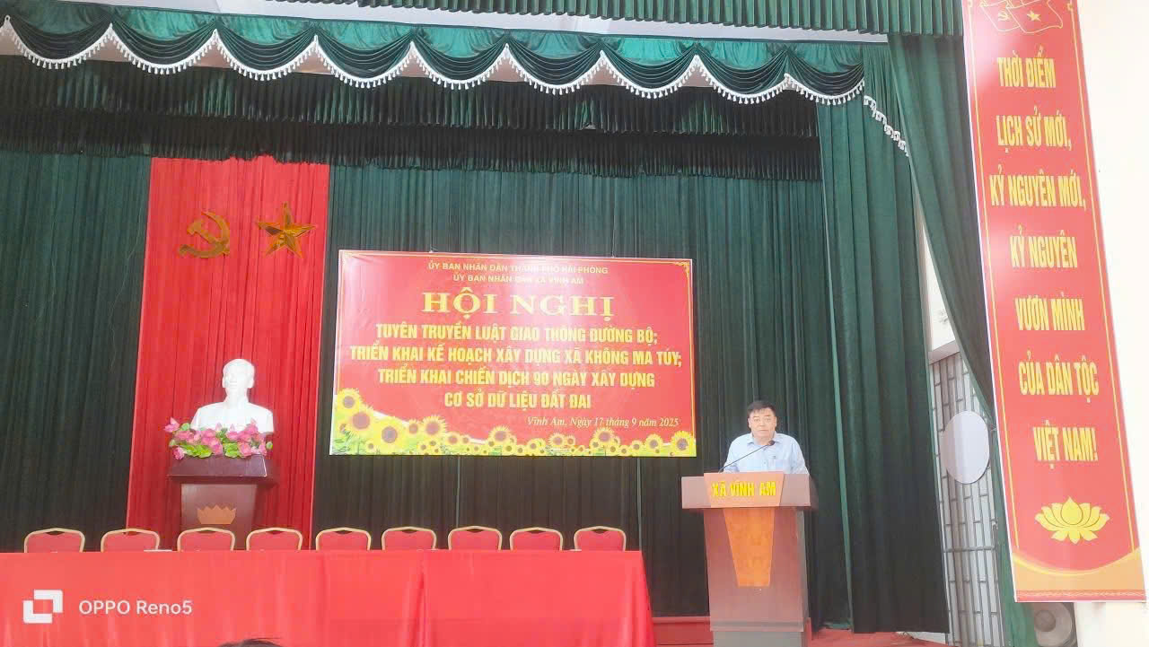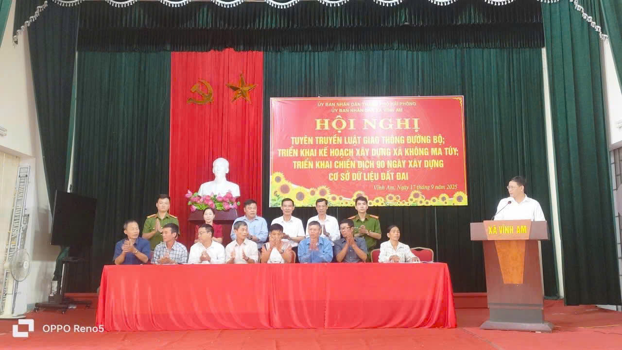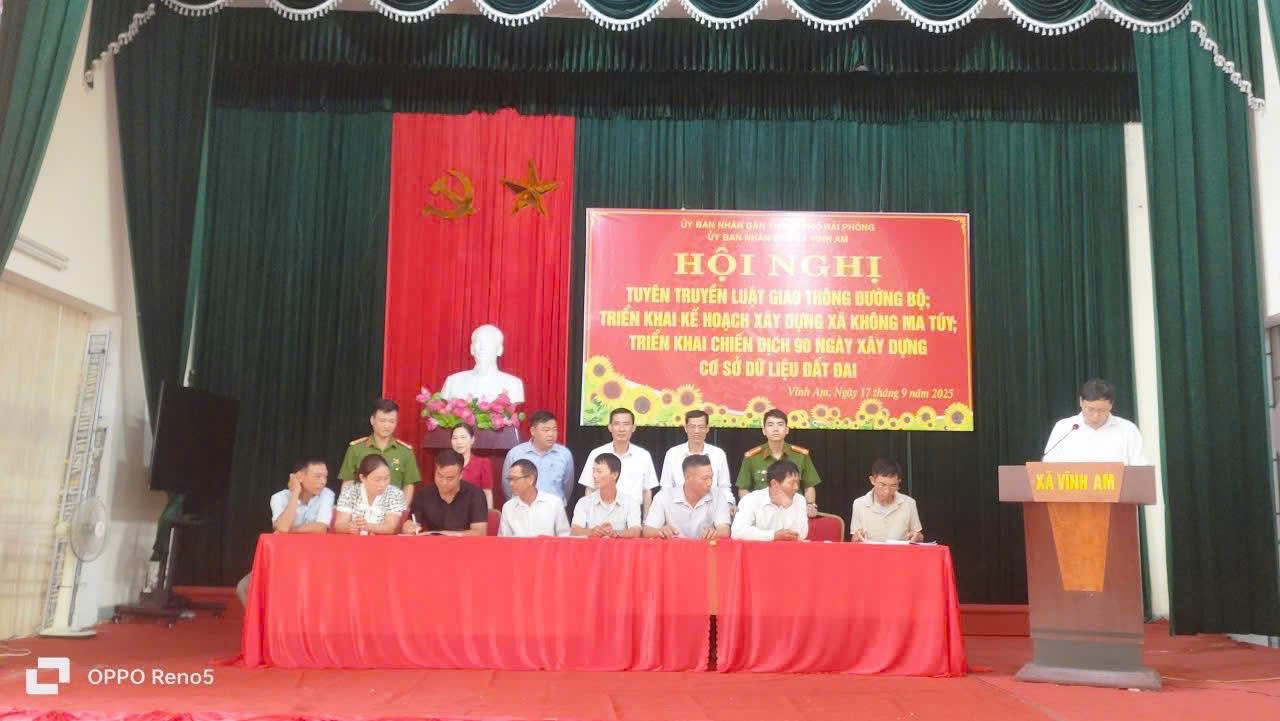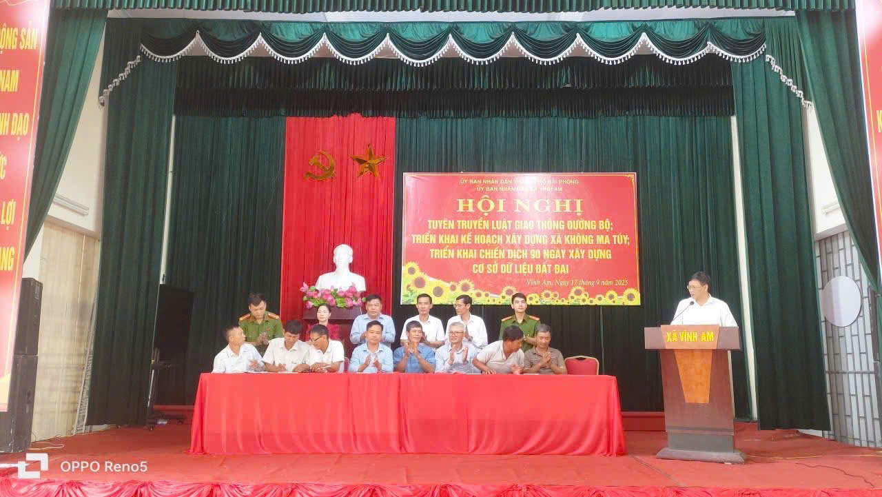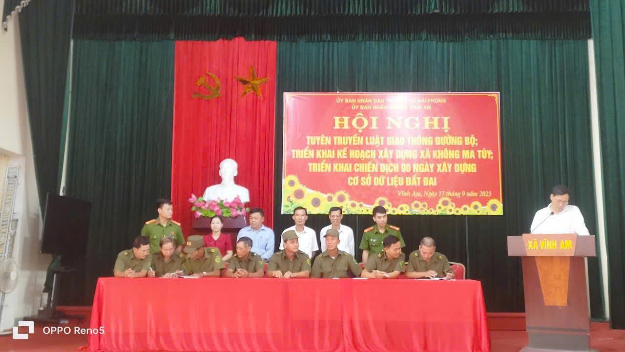 Sáng ngày 17/9/2025 UBND xã Vĩnh Am tổ chức hội nghị triển khai 2 nội dung: Kế hoạch xây dựng xã không ma túy; tuyên truyền luật giao thông đường bộ; ký cam kết thực hiện xây dựng địa bàn không ma túy; đảm bảo an toàn giao thông trên địa bàn xã và Triển khai chiến dịch 90 ngày xây dựng, hoàn thiện cơ sở dữ liệu đất đai trên địa bàn xã Vĩnh Am.